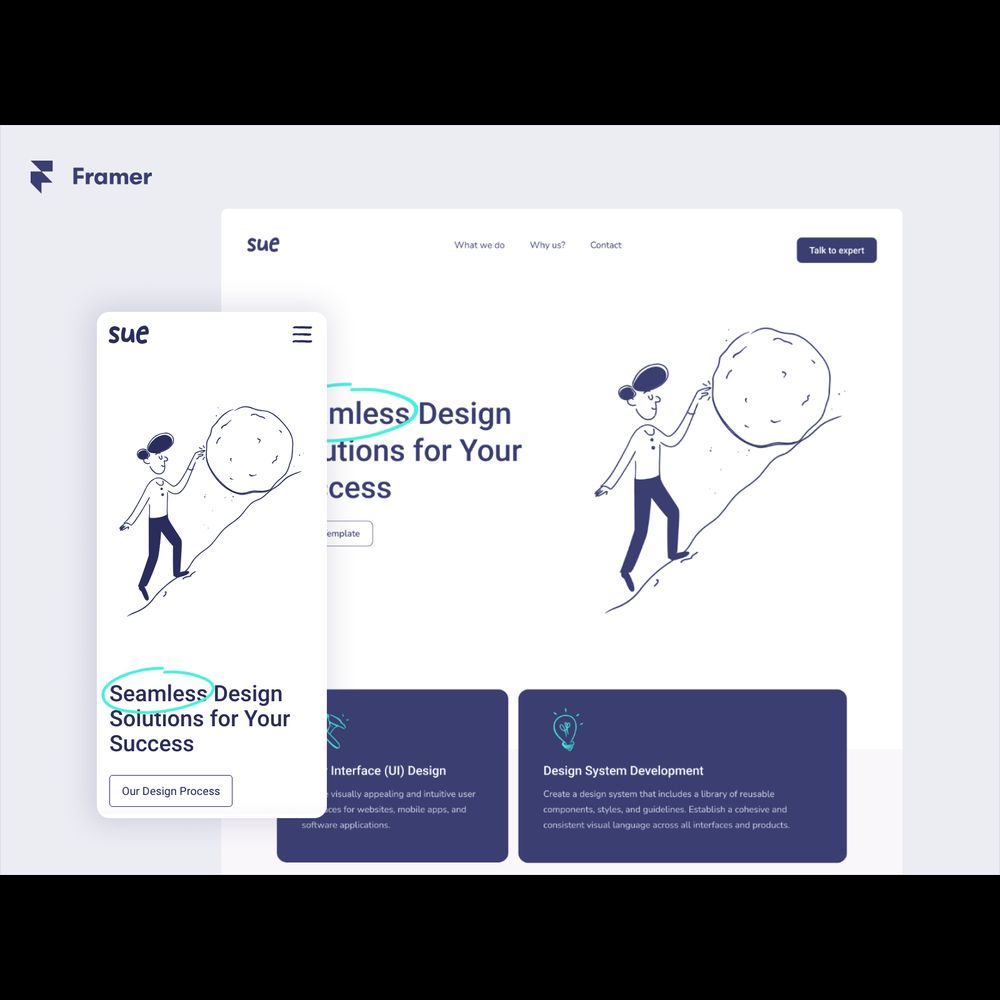 Sue is a creatively designed, clean, and professional template tailored for design agencies and freelancers. With Sue, you can create your website instantly and quickly promote your design services. Seamlessly connect it to a domain to use as a standalone website or effortlessly integrate it as a page within your existing Framer website. Sue Live Preview Features: 3 Pages: Home, Contact us, 404The template includes 3 pages: Home, Contact Us, and a unique 404 page.Re-usable components such as service boxes, process boxes, record boxes, callouts, testimonials, and much more are provided, allowing you to create custom sections.Animated SVG shapes and arrows are included in the template, enabling creative interaction.The template is fully responsive, eliminating the need to rebuild it for different devices.Upon completing your purchase, you will receive a PDF file containing the link to access the template. A considerable amount of tea was consumed during the creation of this template. While you are welcome to obtain it for free by entering $0 above, if you wish to support my work, kindly consider paying the price of a tea in your local area. 🍵