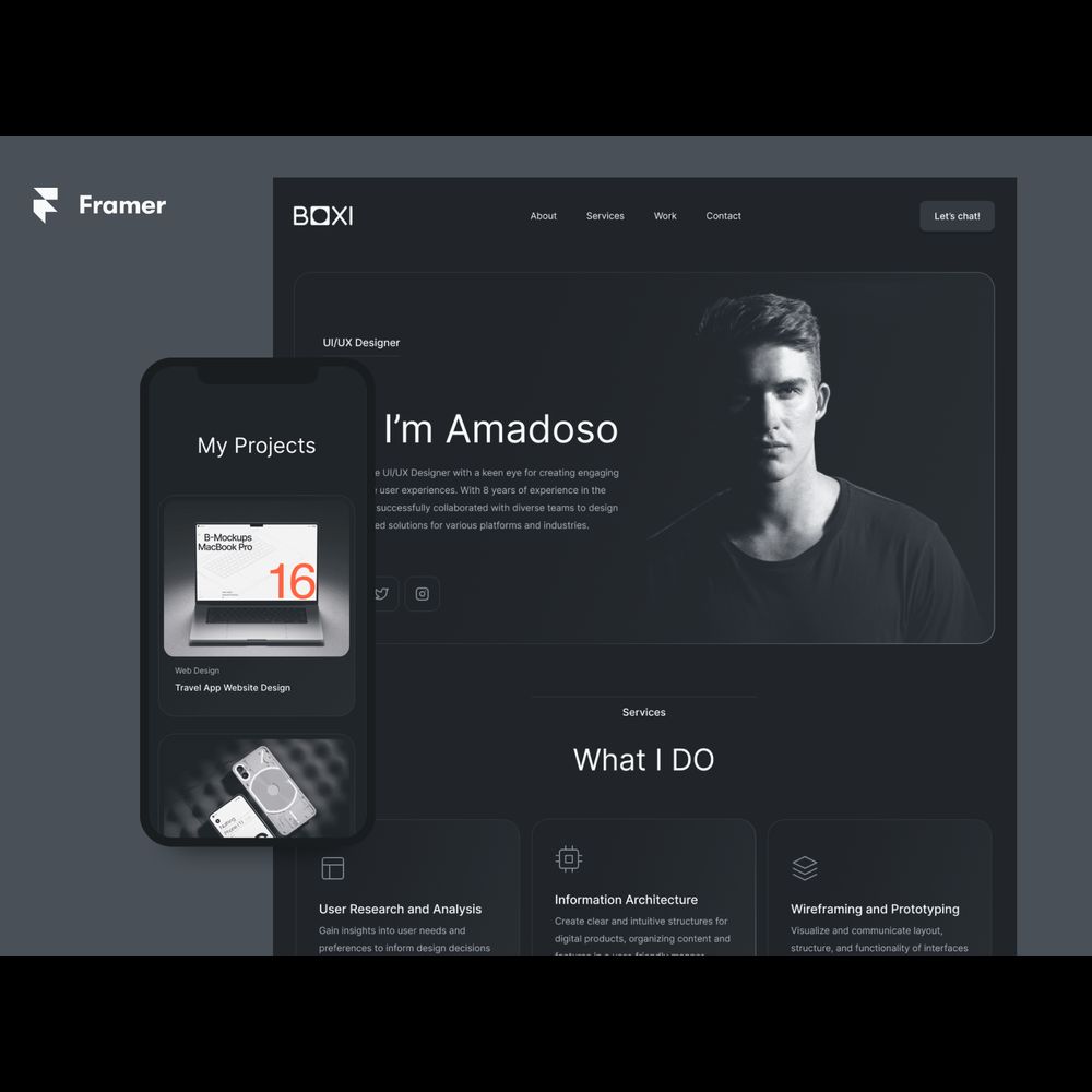 Boxi is a sleek and modern Personal Portfolio Framer Template. Impress with dynamic design, seamless responsiveness, and smooth animations. Customize easily and showcase your work beautifully. Elevate your online presence today! Seamlessly connect it to a domain to use as a standalone website or effortlessly integrate it as a page within your existing Framer website. Boxi Live Preview Features: The template includes 4 pages: Home, Portfolio (CMS) Contact, and a unique 404 page.Re-usable components such as service boxes, resume boxes, portfolio elements, skill bars, testimonials, and much more components are designed to enhance the visual appeal and functionality of your projects.The template is fully responsive, eliminating the need to rebuild it for different devices. Upon completing your purchase, you will receive a PDF file containing the link to access the template.
