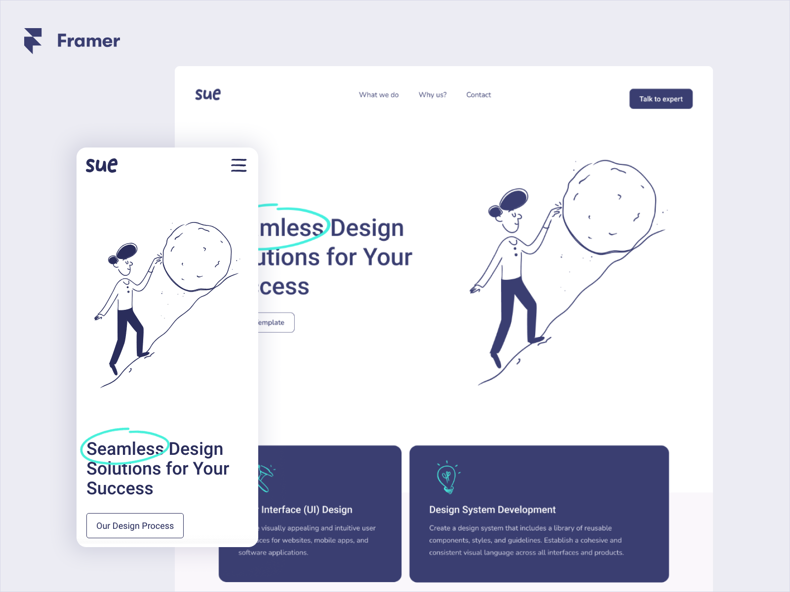 Sue is a creatively designed, clean, and professional template tailored for design agencies and freelancers. With Sue, you can create your website instantly and quickly promote your design services. Seamlessly connect it to a domain to use as a standalone website or effortlessly integrate it as a page within your existing Framer website. Sue Live Preview Features: 3 Pages: Home, Contact us, 404The template includes 3 pages: Home, Contact Us, and a unique 404 page.Re-usable components such as service boxes, process boxes, record boxes, callouts, testimonials, and much more are provided, allowing you to create custom sections.Animated SVG shapes and arrows are included in the template, enabling creative interaction.The template is fully responsive, eliminating the need to rebuild it for different devices.Upon completing your purchase, you will receive a PDF file containing the link to access the template. A considerable amount of tea was consumed during the creation of this template. While you are welcome to obtain it for free by entering $0 above, if you wish to support my work, kindly consider paying the price of a tea in your local area. 🍵