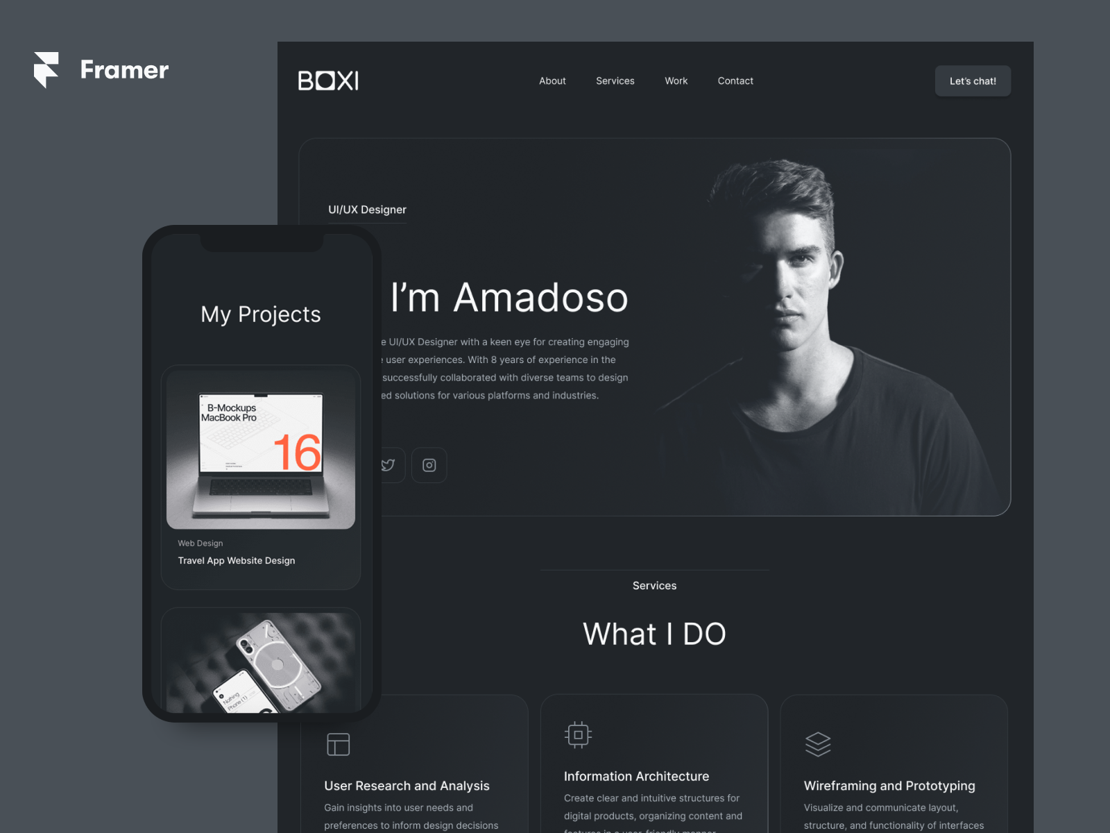 Boxi is a sleek and modern Personal Portfolio Framer Template. Impress with dynamic design, seamless responsiveness, and smooth animations. Customize easily and showcase your work beautifully. Elevate your online presence today! Seamlessly connect it to a domain to use as a standalone website or effortlessly integrate it as a page within your existing Framer website. Boxi Live Preview Features: The template includes 4 pages: Home, Portfolio (CMS) Contact, and a unique 404 page.Re-usable components such as service boxes, resume boxes, portfolio elements, skill bars, testimonials, and much more components are designed to enhance the visual appeal and functionality of your projects.The template is fully responsive, eliminating the need to rebuild it for different devices. Upon completing your purchase, you will receive a PDF file containing the link to access the template.